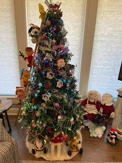 I've had this ladder going up the side of the tree with 2 wooden elves that my Mom and Dad made many, many years ago. One of the elves is missing a leg and the other has a broken hand. Even though I can't throw them away (they're in storage) I decided to put my Snoopy characters going up the ladder.